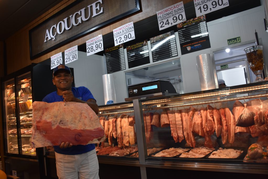 No açougue, a oferta é completa: picanha, vazio, chuleta, maminha, costela, salsichão, linguiça campeira e cortes suínos como paleta, carré, costelinha, filézinho e sobrepaleta, sendo os clientes atendidos por uma equipe de três açougueiros.